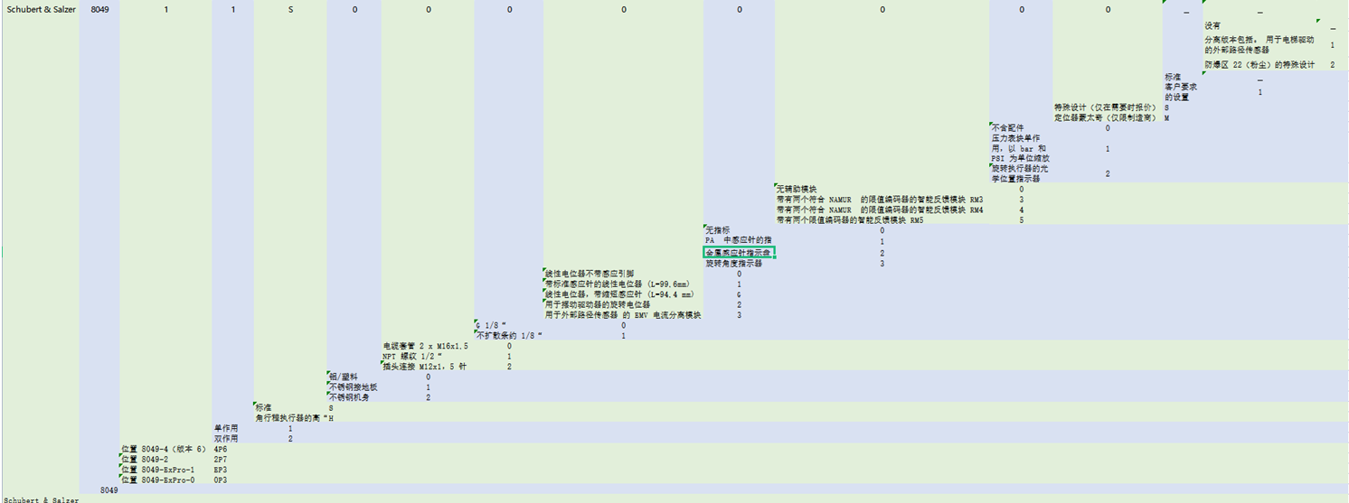 Schubert & Salzer-8049系列 阀门定位器 选型问题? 基本设计是什么? 位置 8049-4(版本 6) 4P6 位置 8049-2 2P7 位置 8049-ExPro-1 EP3 位置 8049-ExPro-0 0P3 执行器有几种? 单作用 1 双作用 2 空气输送几种? 标准 S 角行程执行器的高“标准” H 机身几种? 铝/塑料 0 不锈钢接地板 1 不锈钢机身 2 电-气连接是什么样? 电缆套管 2 x M16x1,5 0 NPT 螺纹 1/2“ 1 插头连接 M12x1,5 针 2 气动连接是什么样? G 1/8“ 0 不扩散条约 1/8“ 1 位置测量有多少种? 线性电位器不带感应引脚 0 带标准感应针的线性电位器 (L=99,6mm) 1 线性电位器,带缩短感应针 (L=94,4 mm) G 用于摆动驱动器的旋转电位器 2 用于外部路径传感器 的 EMV 电流分离模块 3 辅助模块有什么? 无辅助模块 0 带有两个符合 NAMUR 的限值编码器的智能反馈模块 RM3 3 带有两个符合 NAMUR 的限值编码器的智能反馈模块 RM4 4 带有两个限值编码器的智能反馈模块 RM5 5 配件有那些? 不含配件 0 压力表块单作用,以 bar 和 PSI 为单位缩放 1 旋转执行器的光学位置指示器 2 更多详情有什么? 特殊设计(仅在需要时报价) S 定位器蒙太奇(仅限制造商) M 设置有几种? 标准 客户要求的设置 1 特殊设计有那些? 没有 分离版本包括。 用于电梯驱动的外部路径传感器 1 防爆区 22(粉尘)的特殊设计 2